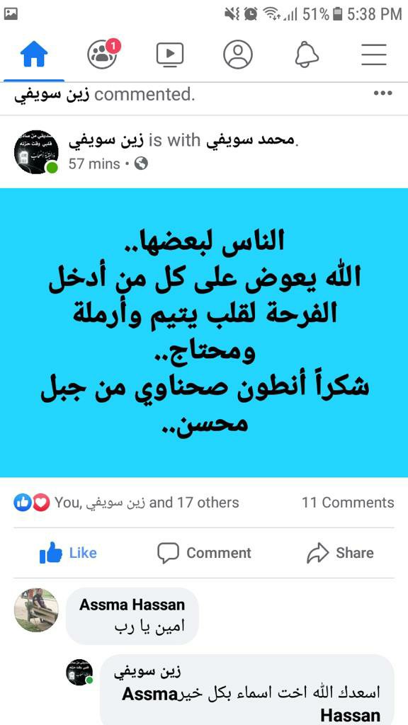 – لكن الملفت أيضاً أن بعض المؤسسات الكبرى كبنك SGBL المتمثل بشخص السيد أنطون صحناوي العابرون للطوائف والمناطق الذين يقومون بمبادرات متنوعة منذ مدة على مساحة كامل الوطن لم يقفوا مكتوفي الأيدي في هذه الأزمة التي يمر بها سائر الشعب اللبناني، فبادروا بما يتوجه عليهم الواجب الوطني والإنساني ومدوا يد العفو لطرابلس وأرجائها بما فيها منطقة جبل محسن.. (مشكورين).