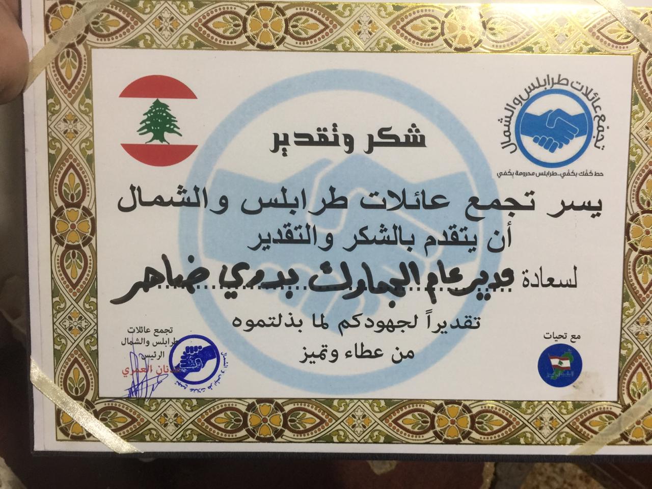 وبدوره شكر رئيس التجمع عدنان العمري مدير عام الجمارك اللبنانية الدكتور بدري ضاهر على هذه المبادرة الطيبة، وأكد أن هذه المساهمة سيتم توزيعها على الناس المحتاجين .. وارسل له بطاقة شكر وتقدير..
