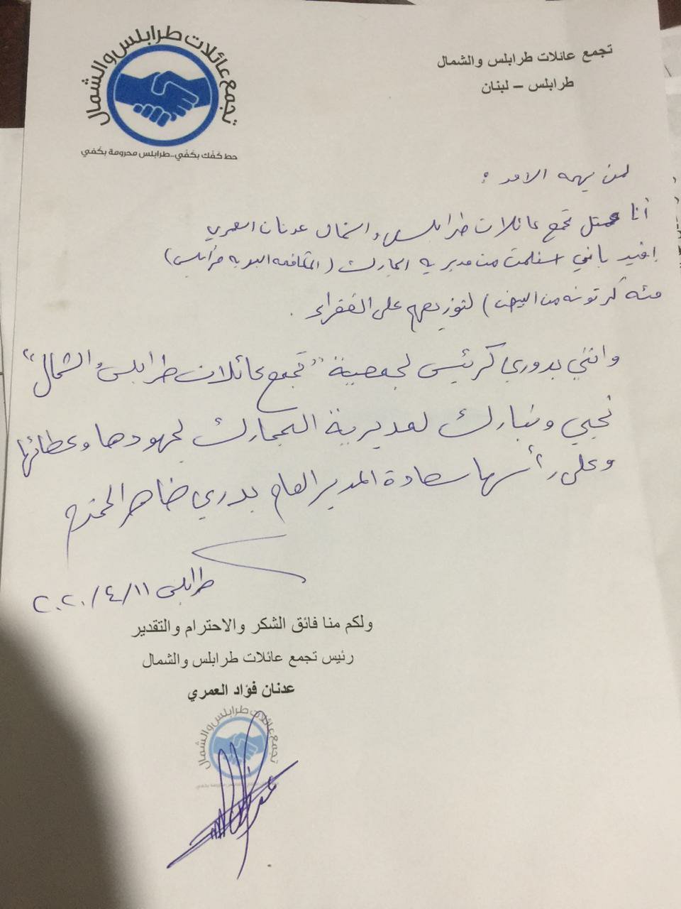 تسلم رئيس تجمع عائلات طرابلس والشمال عدنان العمري من مديرية الجمارك اللبنانية مئة كرتونة بيض مساهمة للمحتاجين من أهالي وسكان طرابلس كهدية باسم التجمع ..