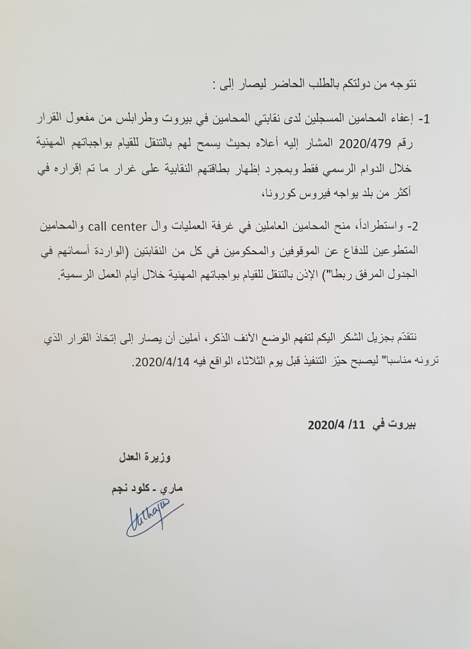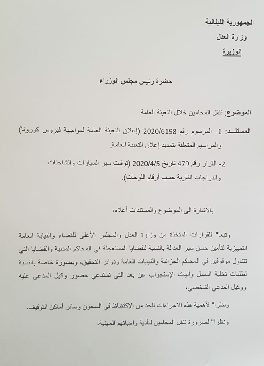 عطفاً على المحادثات والاتصالات التي جرت مع معاليك حول اعفاء المحامين من تطبيق القرار رقم 479 الصادر عن معالي وزير الداخلية محمد فهمي بتاريخ 5/4/2020، والمتعلق بتوقيت سير السيارات والشاحنات والدراجات النارية حسب ارقام اللوحات، وذلك نظراً لطبيعة ومهام المحامي في هذه الظروف الإستثنائية بالذات،وعطفاً على البيانات بتاريخ 3/3 و6/3 و 13/3 و 29/3/2020 الصادرة عن معاليك ومجلس القضاء الاعلى، والتي حددت بموجبها آلية تنظيم العمل في المحاكم والدوائر القضائية بسبب الظروف الاستثنائيةالمستمرة المتعلقة بفيروس الكورونا والتي أكدت جميعها على استمرار المراجع القضائية الجزائية في البتّ بطلبات تخلية سبيل الموقوفين وفق التعاميم بهذا الصدد عن مجلس القضاء الاعلى وعن النائب العام التمييزي،وعطفاً على التعميم الصادر عن حضرة رئيس مجلس القضاء الاعلى رقم 67/ص ق / 2020 حول الاستجوابات عن بعد عبر الوسائل الإلكترونية,وعطفاً على موافقة حضرة مدعي عام التمييز رقم 1886/و / 2020 على اعتماد مركزية طلبات تخلية السبيل لسجون الشمال لدى نقابة المحامين في طرابلس،