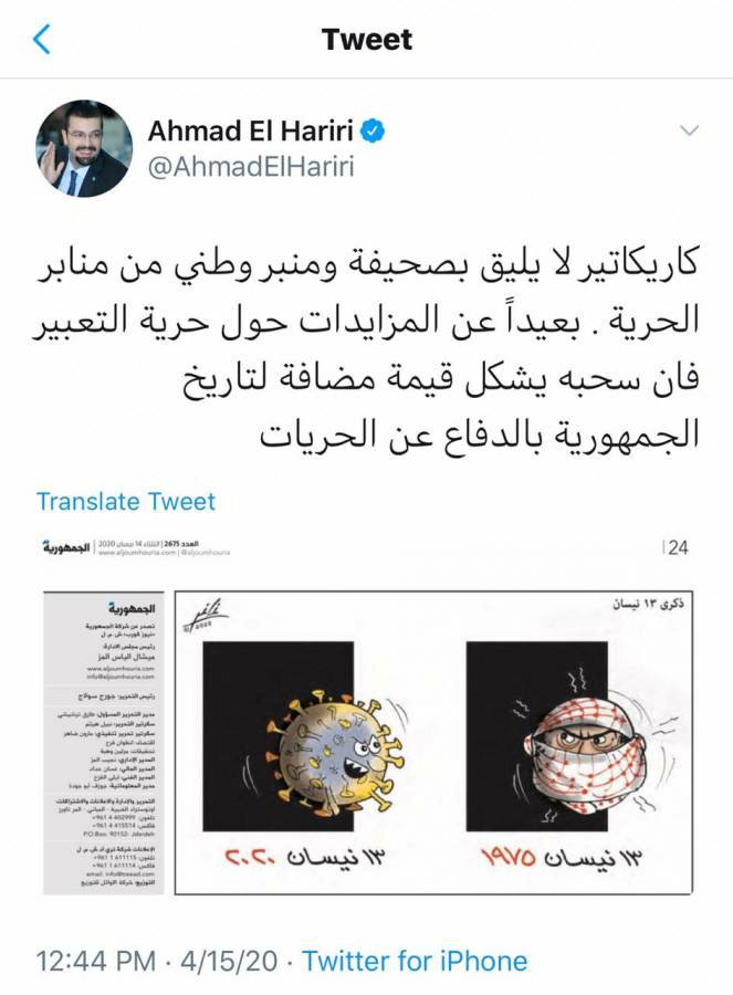 علق الأمين العام ل”تيار المستقبل” أحمد الحريري، على كاريكاتير “الجمهورية” في ذكرى ١٣ نيسان بالقول عبر “تويتر”: “كاريكاتير لا يليق بصحيفة ومنبر وطني من منابر الحرية. بعيداً عن المزايدات حول حرية التعبير فان سحبه يشكل قيمة مضافة لتاريخ “الجمهورية” بالدفاع عن الحريات