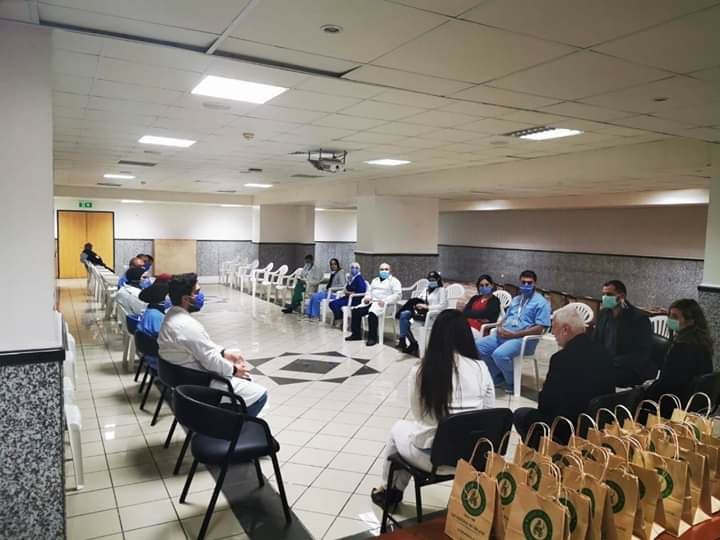 زارت رئيسة جمعية “الدار العالي” عقيلة النائب الدكتور علي درويش السيدة أليسار بركات على رأس وفد من الجمعية، مستشفى الشفاء في طرابلس ضمن اطار حملة دعم وتكريم الطواقم الطبية في طرابلس والتي تقيمها “الدار العالي” وقرية بدر حسون البيئية – خان الصابون تقديراً لجهودهم، حيث تم تقديم هدايا رمزية للممرضين والأطباء العاملين في قسم طوارئ كورونا من انتاج خان الصابون.وجالت السيدة أليسار بركات في أرجاء مستشفى الشفاء حيث اطلعت على التجهيزات فيها والاستعدادات للتعامل مع مصابي الكورونا والجاهزية العالية للطاقم الطبي فيها مؤكدة على “الدور الكبير القائم على عاتق الاطباء والممرضين في هذه المرحلة والتقدير الكبير لهم وللدور الانساني الذي يقومون به واننا سوياً سنستطيع التغلب على الوباء وتخطي هذه المرحلة بأقل الخسائر.”من جهتهم، شكر مدير مستشفى الشفاء الدكتور أحمد خالد والطاقم الطبي المكرم، السيدة أليسار بركات والدكتور بدر حسون على هذه المبادرة الطيبة والتي تعكس روح المسؤولية والإنسانية لديهم والتعاضد الإجتماعي العابر لكل الحواجز مؤكدين تقديرهم لما تقوم بها الدار العالي وخان الصابون من مبادرات انسانية رغم كل الضغوط.