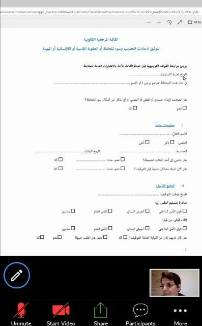 ثم كان نقاش وحوار حول القائمة المرجعية القانونية لتوثيق إدعاءات التعذيب وسوء المعاملة او العقوبة القاسية او اللإنسانية أو المهينة، وهي عبارةً عن إستمارةٍ لآلية عمل يستخدمها المحامون بمجموعة أسئلة، حيث تم قراءة الإستمارة ومناقشتها وتعديل بعض بنودها، ثم تم الإتفاق على مراجعتها ودراستها بشكلٍ دقيقٍ لتقديم الإقتراحات القانونية المناسبة ضمن مهلة 48 ساعة.