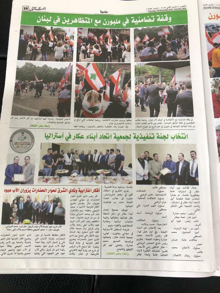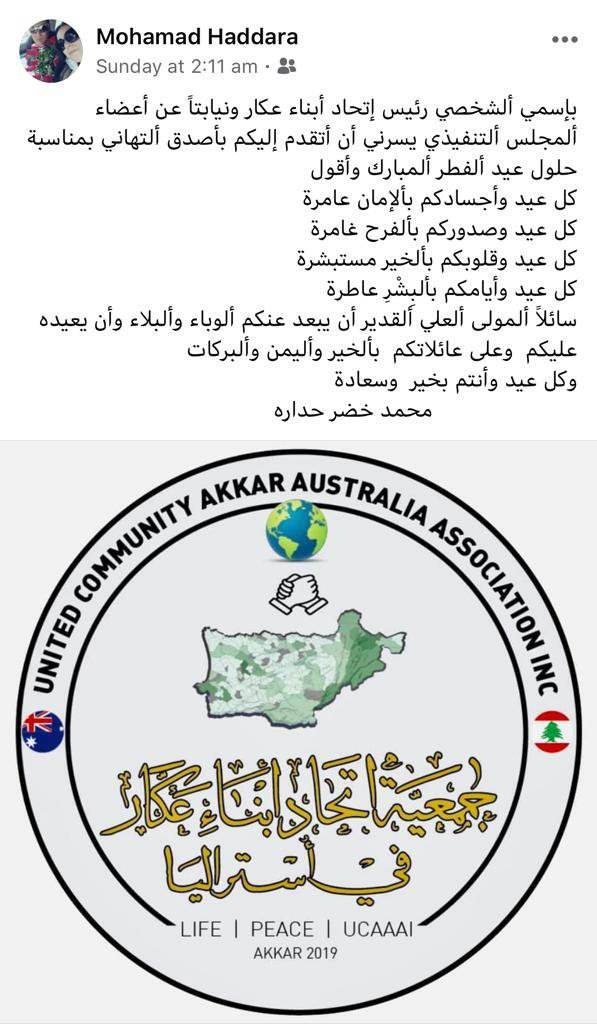 وفي اتصال مع رئيس الاتحاد محمد حدارة ، أكد أن هذا الاتحاد يضم نخبة من أبناء عكار في ملبورن وكل استراليا ، وكلنا إخوة متعاونين في سبيل الخير لأبناء الوطن في استراليا ولبنان عامة وعكار خاصة . ..