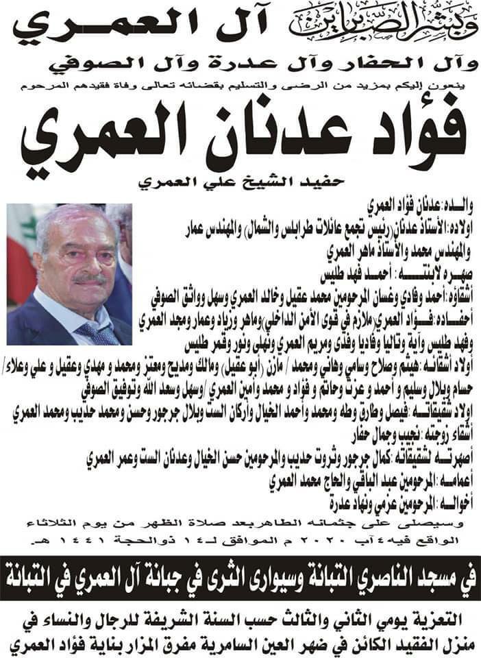 نعى أعضاء وأركان ومجلس امناء تجمع عائلات طرابلس والشمال عميده المغفور له الحاج فؤاد عدنان العمري (والد رئيس التجمع عدنان العمري ) ..