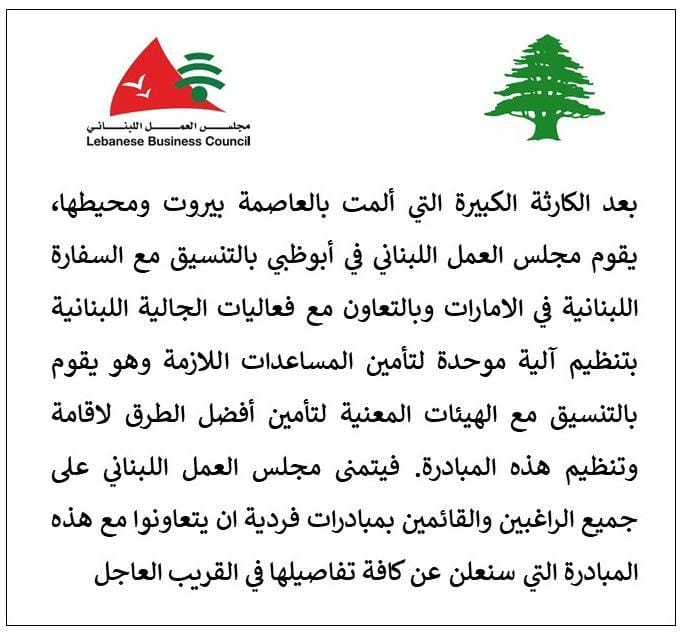 أعلن مجلس العمل اللبناني في أبو ظبي برئاسة المهندس سفيان الصالح وأركان اعضاء المجلس عن البدء بمبادرة إنسانية ودعم لوجستي لمتضرري كارثة بيروت وضواحيها ، وذلك بالتعاون مع السفارة اللبنانية في الامارات العربية المتحدة ممثلة بسعادة السفير الدكتور فؤاد شهاب دندن وأركان وفاعليات الجالية اللبنانية في الامارات …