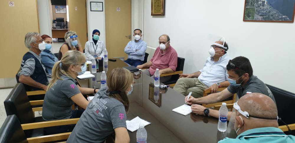 بحضور مدير المستشفى ناصر عدرة والمدير الطبي د حلمي الشمروخ ورئيس دائرة التمريض رلى الحج ورئيس قسم العناية الفائقة د خالد العويني ومسؤول قسم الكورونا د فادي فنيانوس ومسؤولة مكافحة العدوى رانيا الاحمد