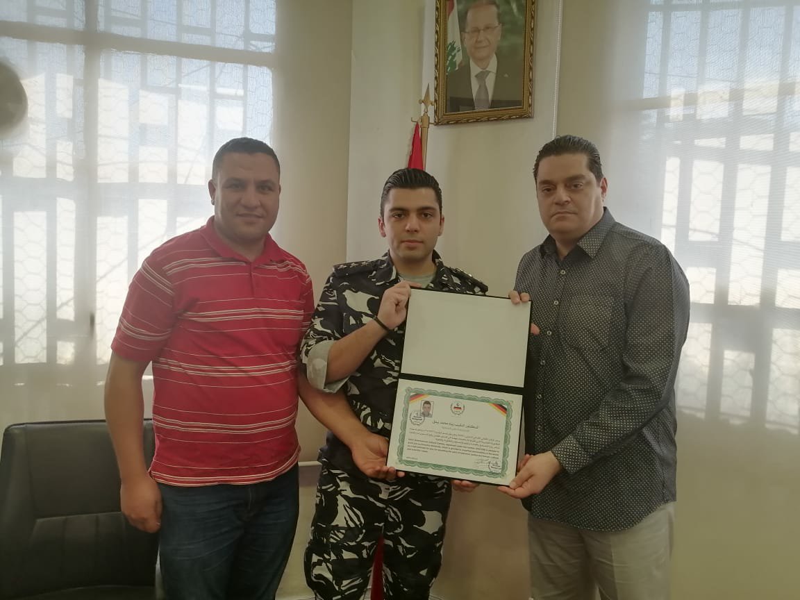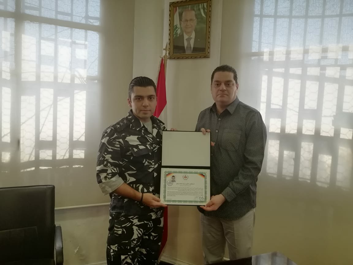 الدكتور محمود الخطيب ممثلاً بمدير العام للمركز في شمال لبنان السفير الدكتور طلال صوراني وبحضور مستشار المركز الأستاذ جمال النابوش تم منح شهادة دكتوراة فخرية في العلوم العسكرية للنقيب زياد يمق آمر فصيلة التل .