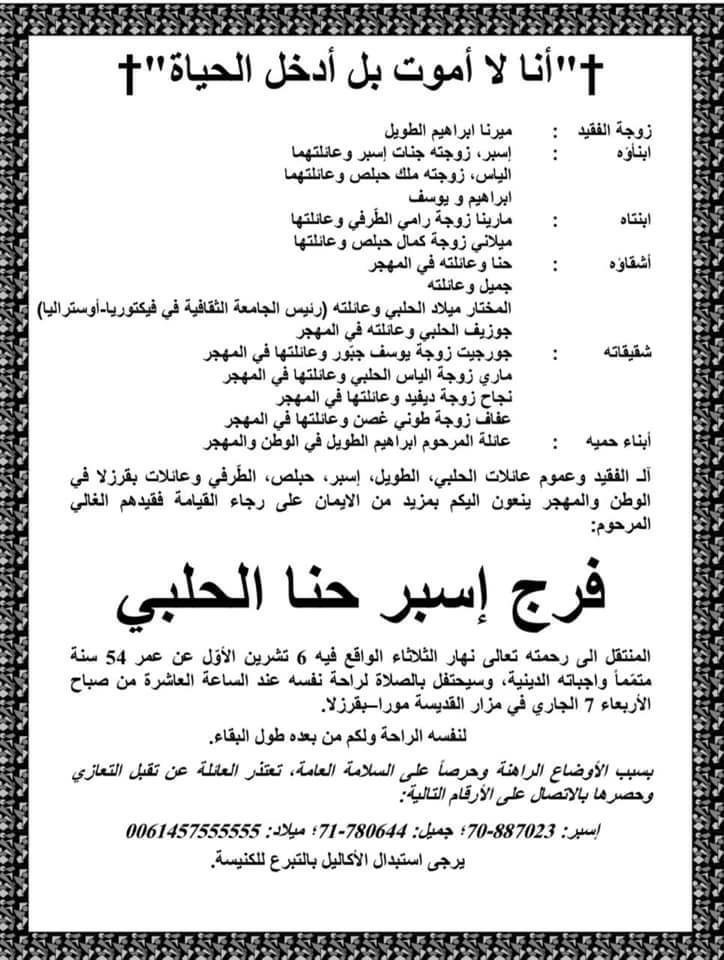 غيب الموت في بقرزلا – عكار صباح اليوم الثلاثاء بتاريخ ٢٠٢٠/١٠/٦ المأسوف على شبابه المرحوم فرج أسبر الحلبي وهو شقيق رئيس الجامعة اللبنانية الثقافية في اوستراليا – ملبورن المختار ميلاد الحلبي …
