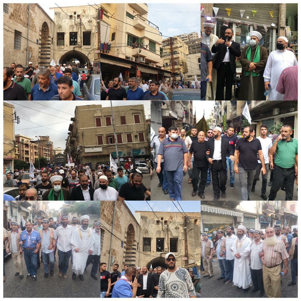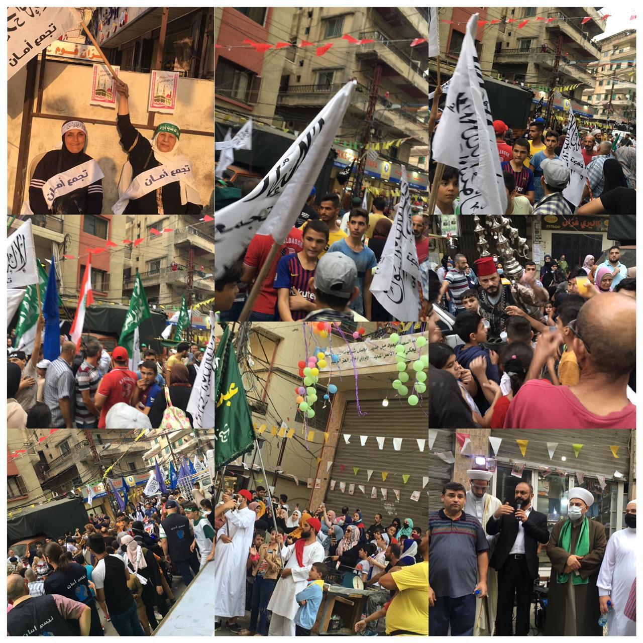 الالاف في مسيرة حاشدة تنظمها حركة تجمع امان بمشاركة جمعيات كشفية وقوى اهلية وشعبية تحت عنوان : على خطى القائد رغم الحاقد لبيك يا رسول الله وقد انطلقت المسيرة من المسجد المنصوري الكبير مروراً بمحلة الحدادين وساحة الكورة و التل وصولا الى الزاهرية حيث اقيم احتفال امام مصلى الامام زين العابدين في الزاهرية وقد القى رئيس حركة تجمع امان الشيخ الدكتور محمد الحزوري كلمة في الاحتفال بين فيها معاني الذكرى واهمية الاحتفال لجمع الناس على الخير واظهار الفرح والسرور بمولد سيدنا محمد عليه الصلاة والسلام وأثره الايجابي في الناس لتحريك قلوبهم لسلوك دربه واتباع سننه وقال ان ما نقوم به هذه الذكرى هو إظهار السرور بمولده الشريف وقراءة القرآن وتلاوة سيرته واطعام الناس وكل هذا من الخير الذي جاء به ديننا وامرنا الله به كما تطرق الى رفض التصريحات البغيضة التي اطلقها الرئيس الفرنسي في حق رسول الله صلى الله عليه وسلم ومؤكداً ان هذه التصريحات تغذي التطرف ولا تصب في تقوية الاعتدال موضحاً ان الاسلام هو دين العدل والاعتدال وهو دين كل الانبياء الذين دعوا الى عبادة الله وحده وتنزيهه عن مشابهة المخلوقات وأننا نحب كل الانبياء من آدم الى محمد مرورا بموس وعيس عليهم السلام وأكد اننا نفدي رسول الله بدمائنا وارواحنا وابناءنا وان المسلمين في لبنان كباقي بلاد الاسلام يرفضون هذه التصريحات كما يرفضون ان يتعرض الى اي شيء يمس دينهم وشريعتهم واكد ان المسيرة هدفها اظهار الحب لرسول الله ونصرة لدعوته ولا علاقة للسياسيين بها ولم يشاركوا فيها ، وشكر كل الحاضرين وخاصة ممثل قائمقام مفتي طرابلس والشمال فضيلة الشيخ عبد الهادي غزاوي واللجنة التنظيمية المؤلفة من مشايخ الزوايا والنوبات وجمعية كشاف الغد جمعية بيت الاداب والعلوم جمعية العلم والتعليم وجمعية الاصلاح والتعاون الخيرية وصرخة المظلومين و شباب الختيار
