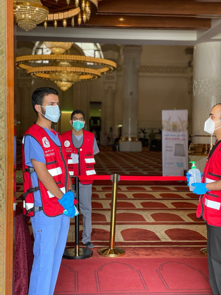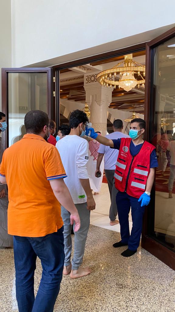 وقدم المتطوعون الفرز البصري بأخذ درجة الحرارة بجهاز الأشعة تحت الحمراء، بالإضافة إلى توعية المصلين بأهمية الإلتزام بالإجراءات الإحترازية والوقائية لجميع المصلين والتأكيد على لبس الكمامة وتعقيم اليدين قبل دخول المصلين الى الجوامع.