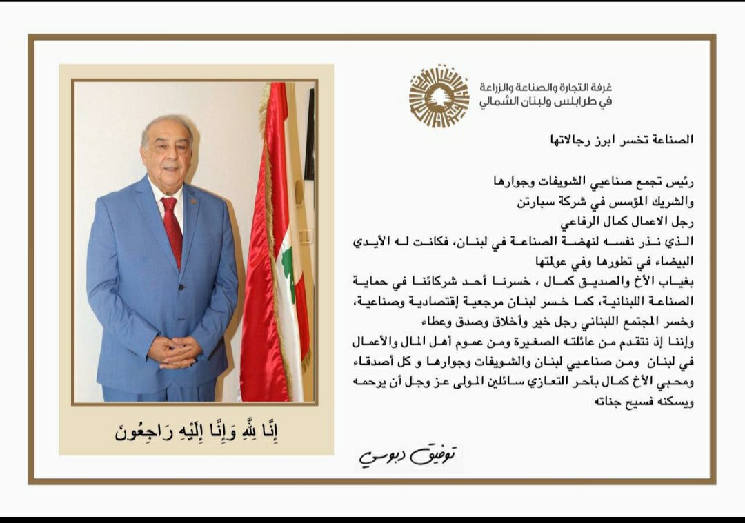نعى رئيس غرفة التجارة الصناعة والزراعة في طرابلس والشمال توفيق دبوسي، رئيس تجمع صناعيي الشويفات وجوارها ،والشريك المؤسس في شركة سبارتن، رجل الاعمال كمال الرفاعي.