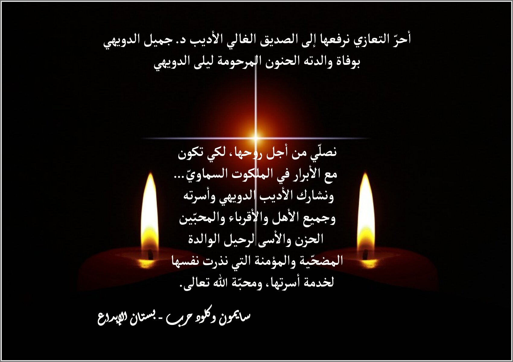 أحرّ التعازي نرفعها إلى الصديق الغالي الأديب د. جميل الدويهي بوفاة والدته الحنون المرحومة ليلى الدويهي