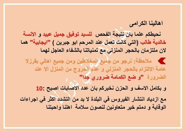 وحث الدكتور شاهين أبناء البلدة على الالتزام بالارشادات الوقائية وعدم المخالطة في المناسبات ، خشية من انتشار هذا الوباء ، وطالب الهيئات المختصة والمعنية وخلية الأزمة متابعة أحوال المصابين وتأمين لهم كافة الحاجيات، وقال : نحن هنا في استراليا وبلاد الانتشار نصلي من أجل شفاء المصابين عامة وابناء بلدتي الحبيبة بقرزلا خاصة .. والسلام والمحبة للجميع ..