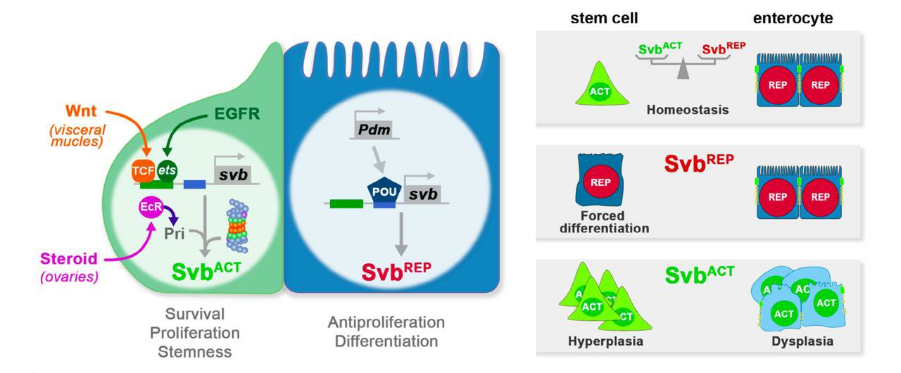 ويُترجم OvoL/Svb مسارات إشارات signaling) pathways) عدة داخل الأمعاء ويتلقى إشارات هرمونية (steroid) من خارجها مما يجعل الخلايا الجذعية تتكاثر أو تتمايز إلى خلايا معوية فاعلة.
