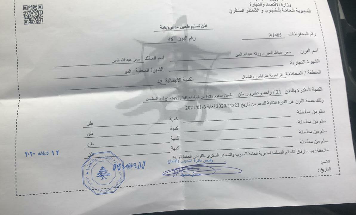*إن هذه الشاحنة التي موجودة أمام أفران المير هي طحين مدعوم للخبز العربي وفيها طحين اكسترا شهباء للحلويات بشهادة امين سر نقابة عمال أفران الشمال طاهر تحصلدار الذي كان موجود صباحاً في الفرن *.