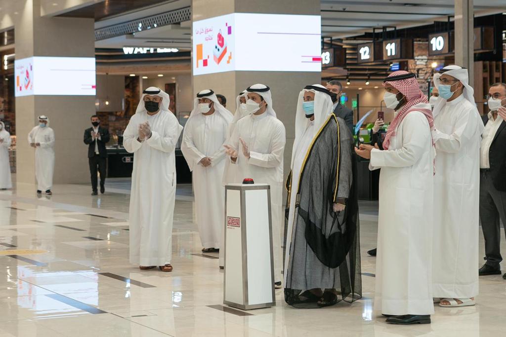 وتفضل سموه فور وصوله بإزاحة الستار الافتتاحي من خلال الضغط على مكبس الافتتاح ايذاناً بافتتاح المركز وبدء استقباله للزوار والمتسوقين.