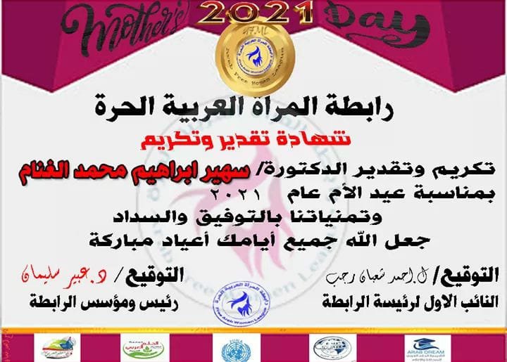 كرمت رابطة المرأة للعربية الحرة الدكتورة سهير ابراهيم محمد الغنام على جهودها المبذولة للنهوض بدور المراءة العربية داخل وخارج الوطن .