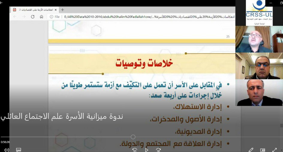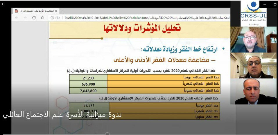 بينما تمحور تحليل المؤشّرات حول ارتفاع خط الفقر وزيادة معدّلاته، وتأثير إيقاف دعم سعر صرف السلع الأساسية، ورأى الدكتور عبد الحليم ” في أسباب الأزمة وأبعادها ثلاثة عناصر، أوّلاً افتعال القدرة الشرائية بتكاليف باهظة من خلال دعم سعر صرف لليرة اللبنانية المثبّت، وثانيًا: الانفصال بين الاقتصاد المالي والاقتصاد الحقيقي، وثالثًا: نمو الاستهلاك بأعلى من نمو الناتج، ورابعًا: النظر إلى الاستهلاك على أنّه من محرّكات النمو”. وفي الخلاصة والتوصيات، اعتبر فضل الله، أنّه يجب على الأسر أن تتكيّف مع أزمة ستستمر طويلاً من خلال إجراءات تتوزّع وفق أربعة صعد: إدارة الاستهلاك، وإدارة الأصول والمدّخرات، وإدارة المديونية، وإدارة العلاقة بين المجتمع والدولة. لافتاً أنّه لا يمكن للأسر من الناحية الواقعية استيعاب نتائج الأزمة من دون دعم قوي من الدولة وبرامج سريعة للإنقاذ والتعافي، مشيراً إلى أنّ ترك الأسر لمصيرها سيُقوّي تيّار الهجرة بمداخيل منخفضة، وسيلحق الضرر بالرأسمال الاجتماعي الذي جرت مراكمته عبر مدّة زمنية طويلة، كما أنّه سيُعزّز ظاهرة الاستبعاد الاجتماعي، وأكّد فضل الله على دور الدولة في هذه المرحلة الانتقالية للحؤول دون تآكل هذا الرصيد.