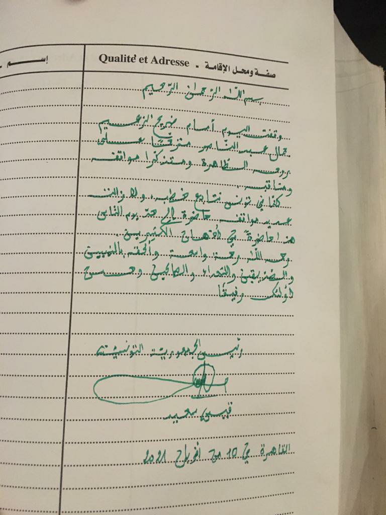 كلمة الرئيس التونسي قيس سعيد فى دفتر الزيارة أثناء زيارته لضريح الزعيم جمال عبدالناصر