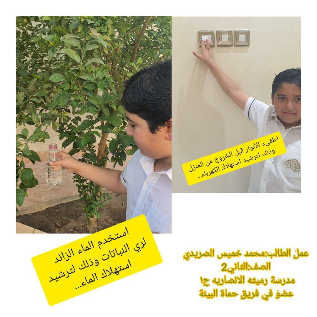 وعليه قامت مدرسة رميثة الأنصارية للتعليم الأساسي ح1 بقيادة الأستاذه فاطمه الخديم باطلاق عدة مبادرات خلال الفصل الدراسي الثالث من العام الحالي منها يد بيد نحو بيئة خضراء ، ومبادرة بسمة أمل، ومبادرة صون لحماية البيئة باشراف اختصاصية المختبر موزه العبدولي والتي كان من أهدافها