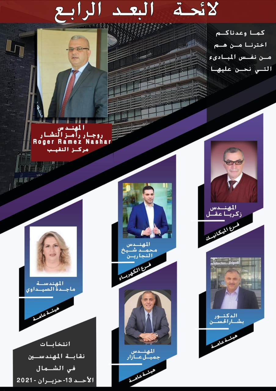 لائحة البعد الرابع برئاسة المهندس روجار رامز النشار وتضم المهندسين : زكريا عقل وبشار الحسن ومحمد شيخ النجارين وماجدة الصيداوي وجميل عازار ..