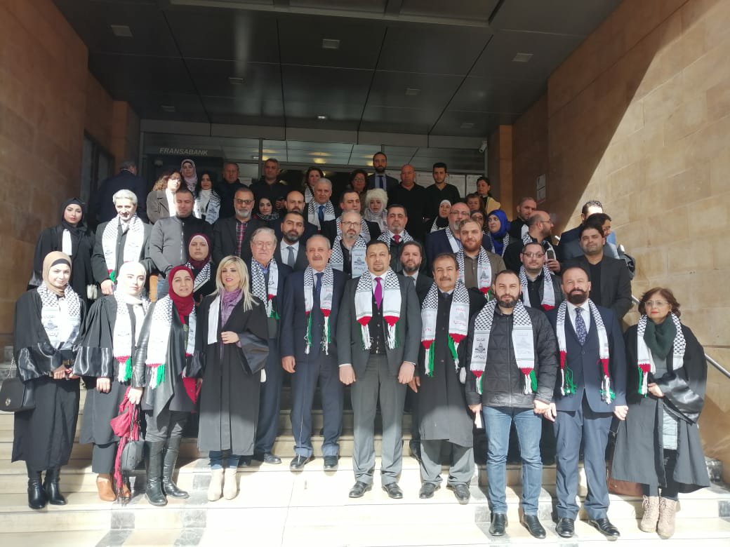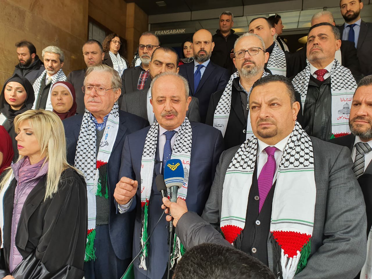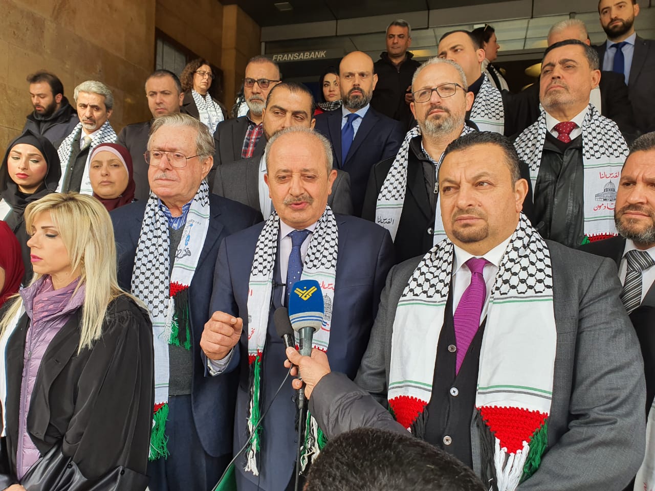الشمال نيوز – عامر الشعاروقفة إحتجاجية لنقابة المحامين في طرابلس على إعلان مايُسمى بصفقة القرننفذ عددٌ من المحامين بمشاركة نقيب المحامين في طرابلس والشمال محمد المراد، وأعضاء مجلس النقابة، وقفةً إحتجاجيةً على إعلان ماتُسمى بخطة السلام بين فلسطين والعدو الإسرائيلي المعروفة بـ ” صفقة القرن”، وذلك أمام دار النقابة في طرابلس.والقى النقيب المراد كلمةً قال فيها:” وقفتنا اليوم جاءت لتؤكد على أن هناك مساراً جديداً يحصل بكل أسفٍ على المستوى العالمي، قد أُعلن عنه خلال الأيام القليلة الماضية لمشروعٍ جديدٍ للشرق الأوسط، إصطلح على تسميته بـ “صفقة القرن”، التي بدأت بوادرها منذ مدة، والتي تُرجمت من خلال الإعلام والإعلان بإرادةٍ منفردة، يُراد بظاهرها خيرٌ للأمة العربية وفلسطين، وتحمل في طياتها الكثير من المطامع على حساب القضية الفلسطينية والحقّ الفلسطيني، وعلى حق العودة إلى فلسطين.وتابع النقيب المراد قائلاً “: نقابة المحامين في طرابلس معنيةٌ في هذا الموضوع، ببعدٍ قانوني وإنساني وعروبي ووطني، وهي معنيةٌ أيضاً يبعدها اللبناني والوطني، لأننا نرى ونشتمّ رائحةً خبيثةً بحقّ لبنان من خلال مايُسمى بـ” صفقة القرن”، لأن لبنان معنيٌّ بها بطريقةٍ غير مباشرة، فليس صحيحاً على الإطلاق مما يُروّج لها، على أنها ستكون مفتاح حلٍّ بين قضيةٍ محقةٍ عادلة، وبين العدو الإسرائيلي، إنما ستطال بتداعياتها المنطقة جميعها ومن ضمنها لبنان، بديموغرافيته، وماأخشاه أن تطال لبنان أيضاً في مياهه البحرية”.”وأضاف النقيب المراد قائلاً “: نقابة المحامين معنيةٌ ليس فقط في وقفةٍ إحتجاجيةٍ كهذه، فهي معنيةٌ أيضاً من خلال عضويتها في إتحاد المحامين العرب، بالدفاع عن القضية الفلسطينية، ومن واجبها الوقوف أمام هذه الأطماع، والصراخ بصوتٍ عالٍ: لا لهذه الصفقة المُذلة، التي يُراد بها إكتساب العديد من المطامع للعدو الإسرائيلي “.وختم النقيب المراد قائلاً” : نقف اليوم لنقول ونؤكد أننا كنقابة محامين ومحامين في طرابلس، سنبقى على تاريخنا، وعلى وقفاتنا الي جانب الحق الفلسطيني، والى جانب القضية الفلسطينية، وهذا وجوبٌ علينا، إضافةً الى الدفاع عن الحق اللبناني، وسيادة لبنان واستقراره.وفي سؤالٍ عن إمكان رفع شكوى قضائية ضد إعلان ترامب، من قبل إتحاد المحامين العرب، أجاب النقيب المراد :” هناك مسارٌ لم يُعلن بطريقةٍ نهائية حتى اليوم، وبخصوص المسألة القضائية فهي تحتاج إلى بحثٍ علمي وقانوني، وأعتقد أن إتحاد المحامين العرب سيوجه دعوةً طارئة بهذا الخصوص، ومن الزاوية القانونية تحتاج إلى تبصّر ودراسات قانونية مُعمقة، حتى نرى من خلالها مشهداً جديداً سواءً على المستوى القانوني او الإجتماعي او الحق العربي.