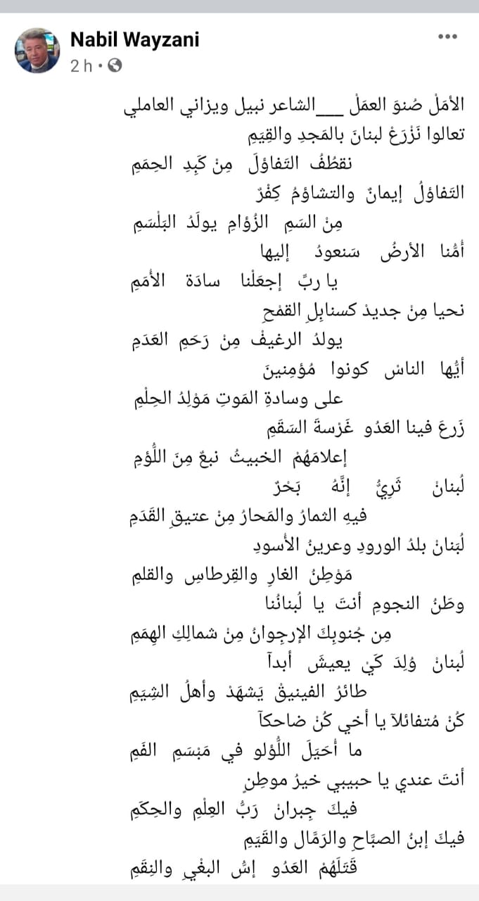 الرئيسية/منوعات/ثقافة وفنون/ألأمَلْ صُنوَ العَمَلْ للشاعر نبيل ويزاني ثقافة وفنون ألأمَلْ صُنوَ العَمَلْ للشاعر نبيل ويزاني أكتوبر 17, 2021 378 فيسبوك تويتر واتساب الشمال نيوز – عامر الشعار شارك هذا الموضوع:فيس بوكX أكتوبر 17, 2021 378 فيسبوك تويتر واتساب شاركها فيسبوك تويتر واتساب تيلقرام مشاركة عبر البريد طباعة