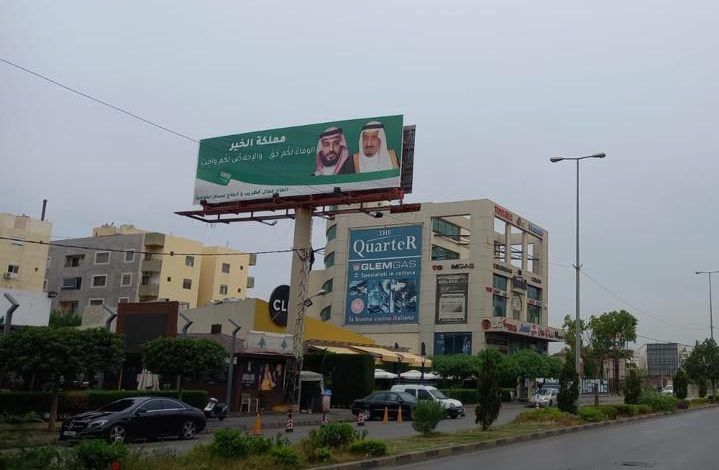 قطريب وحموضة يرفعان الصور العملاقة للملك سلمان وولي العهد محمد بن سلمان في طرابلس