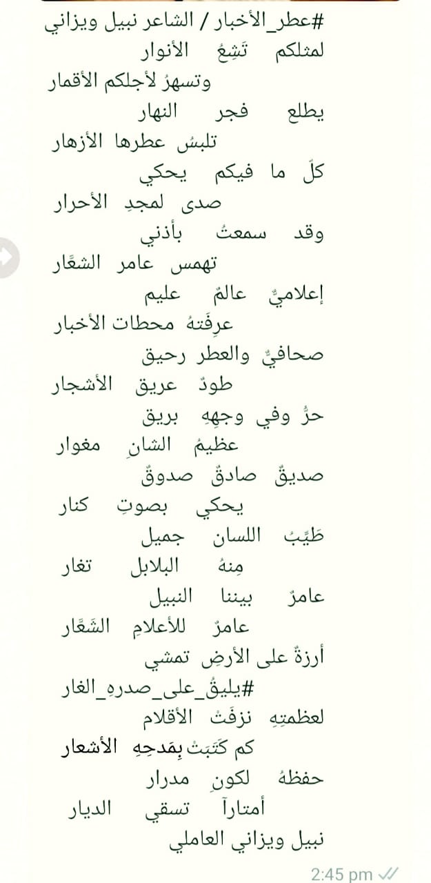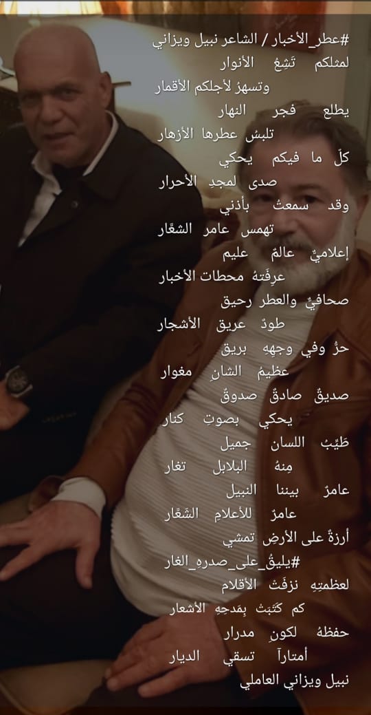 لمثلكم تَشِعُ الأنوار وتسهرُ لأجلكم الأقمار يطلع فجر النهار تلبسُ عطرها الأزهار كلّ ما فيكم يحكي صدى لمجدِ الأحرار وقد سمعتُ بأذني تهمس عامر الشعَّار إعلاميٌّ عالمٌ عليم عرِفَتهُ محطات الأخبار صحافيٌّ والعطر رحيق طودٌ عريق الأشجار حرُّ وفي وجهِهِ بريق عظيمُ الشانِ مغوار صديقٌ صادقٌ صدوقٌ يحكي بصوتِ كنار طَيِّبُ اللسان جميل مِنهُ البلابل تغار عامرٌ ز بيننا النبيل عامرٌ للأعلامِ الشَعَّار أرزةٌ على الأرضِ تمشي #يليقُ_على_صدرهِ_الغار لعظمتِهِ نزفَتْ الأقلام كم كَتَبَتْ بوصفِه أشعار حفظهُ لكونِ مدرار أمتارآ تسقي الديار نبيل ويزاني العاملي