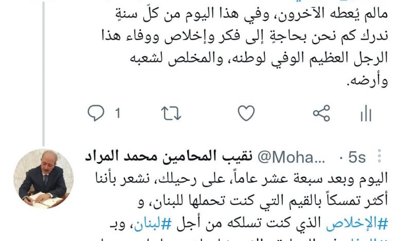 غرّد نقيب المحامين السابق محمد المراد عبر حسابه على تويتر قائلاً :” في الذكرى السابعة عشرة لإغتيال الرئيس الشهيد رفيق الحريري نستذكر رجلاً عظيماً أعطى لبنان مالم يُعطه الآخرون، وفي هذا اليوم من كلّ سنةٍ ندرك كم نحن بحاجةٍ إلى فكر وإخلاص ووفاء هذا الرجل العظيم الوفي لوطنه، والمخلص لشعبه وأرضه.