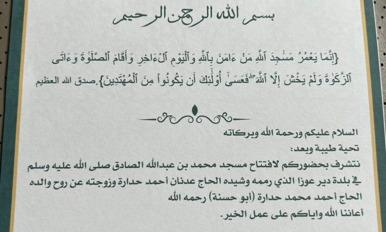 دعوة لإفتتاح مسجد محمد بن عبدالله الصادق عن روح الحاج أحمد حدارة (ابو حسنة) في بلدة دير عوزا