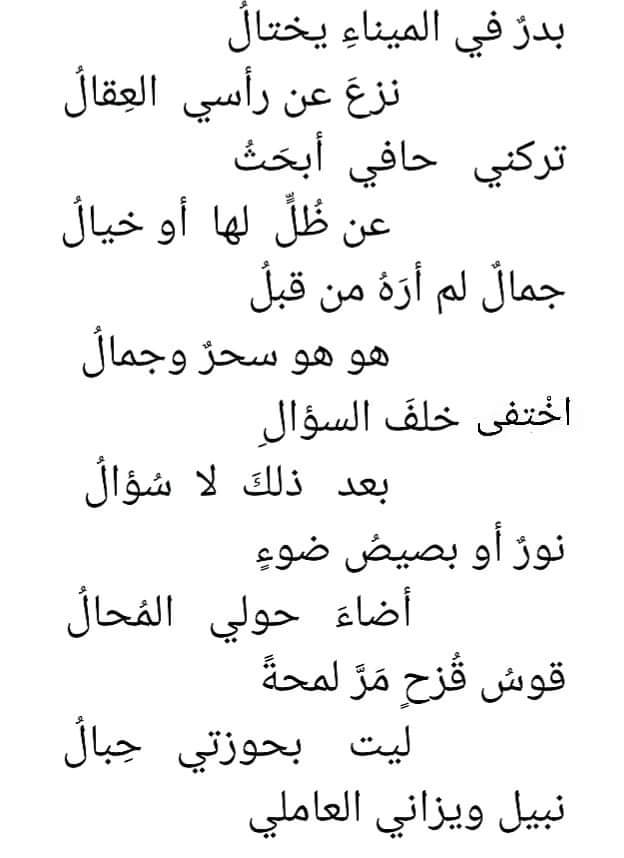 الرئيسية/منوعات/ثقافة وفنون/بدرُ الميناءِ خَيَّالُ .. للشاعر نبيل ويزاني العاملي ثقافة وفنون بدرُ الميناءِ خَيَّالُ .. للشاعر نبيل ويزاني العاملي فبراير 23, 2022 323 فيسبوك تويتر واتساب الشمال نيوز شارك هذا الموضوع:فيس بوكX فبراير 23, 2022 323 فيسبوك تويتر واتساب شاركها فيسبوك تويتر واتساب تيلقرام مشاركة عبر البريد طباعة