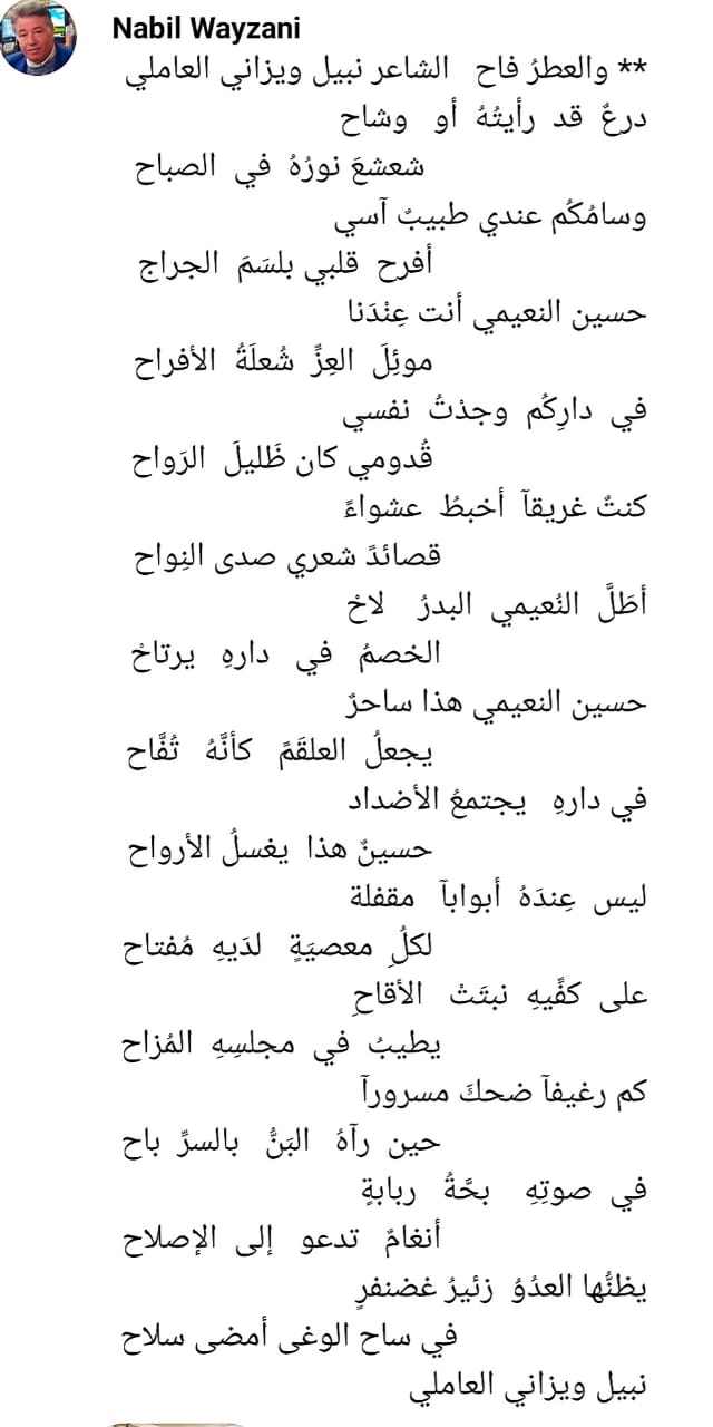 الرئيسية/منوعات/ثقافة وفنون/والعطر فاح .. اهداء الى حسين النعيمي من الشاعر نبيل ويزاني العاملي ثقافة وفنون والعطر فاح .. اهداء الى حسين النعيمي من الشاعر نبيل ويزاني العاملي مارس 3, 2022 447 فيسبوك تويتر واتساب الشمال نيوز – عامر الشعار شارك هذا الموضوع:فيس بوكX مارس 3, 2022 447 فيسبوك تويتر واتساب شاركها فيسبوك تويتر واتساب تيلقرام مشاركة عبر البريد طباعة