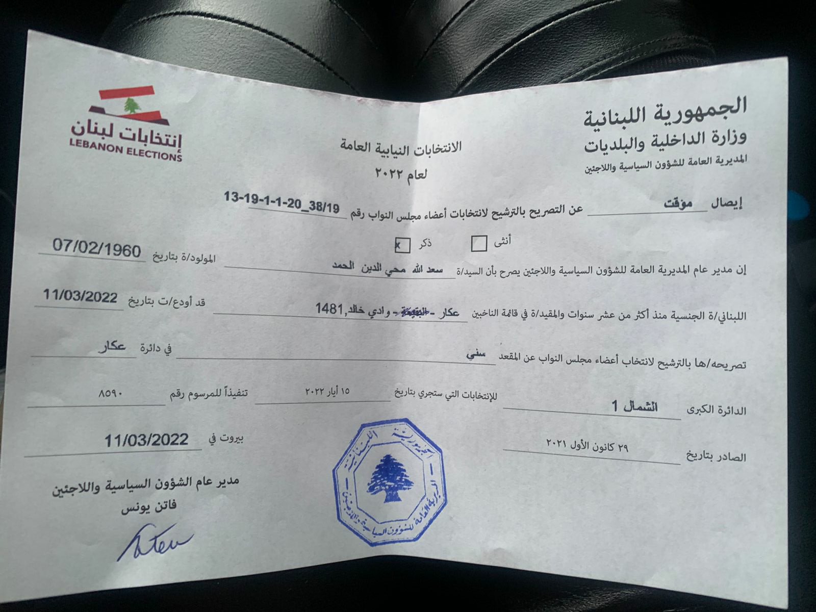 سجل اللواء الركن المتقاعد سعدالله محي الدين الحمد ترشحه عن المقعد السني في عكار وقدم طلبه في وزارة الداخلية ..