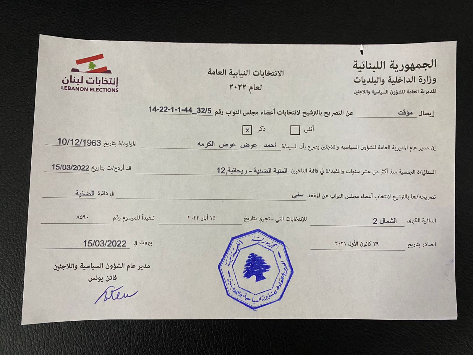 تقدم مسؤول الشؤون السياسية في اتحاد العشائر العربية في لبنان المحامي أحمد الكرمة لدى وزارة الداخلية بطلب ترشيحه عن المقعد السني في الضنية ..