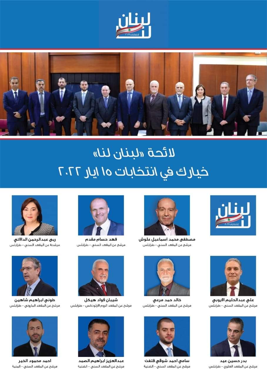 وتضم “لبنان لنا”: عن المقعد السني في طرابلس: الدكتور مصطفى علوش، النقيب فهد المقدم، الدكتورة ربى الدالاتي، السيد علي الايوبي، الدكتور خالد مرعي. عن المقعد الماروني في طرابلس: الدكتور طوني شاهين. عن المقعد الأرثوذكسي في طرابلس: الدكتور شيبان هيكل. عن المقعد العلوي في طرابلس: الأستاذ بدر عيد.