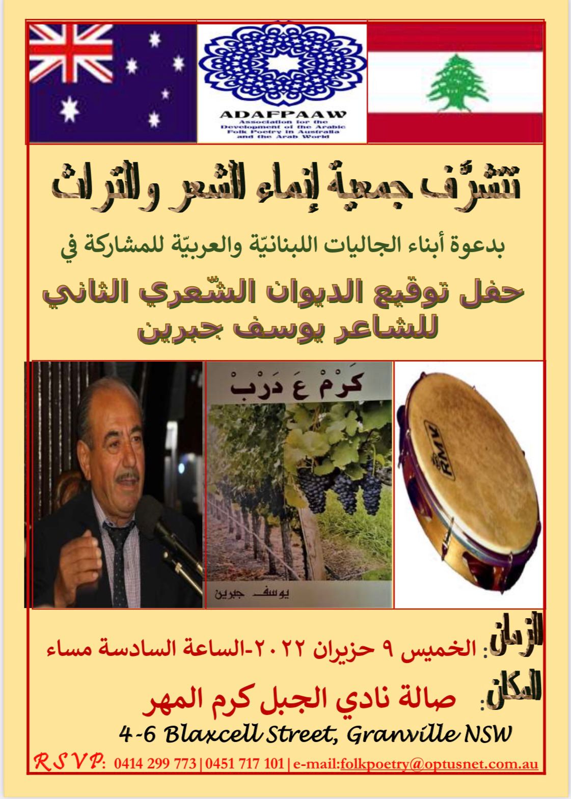 تتشرف رئيسة جمعية انماء الشعر والتراث المحامية الدكتورة بهية ايو حمد بدعوتكم لحضور حفل توقيع الديوان الثاني للشاعر المغترب يوسف جبرين بعنوان كرم ع درب ، وذلك نهار الخميس في 9 حزيران 2022 ، الساعة السادسة مساء في صالة نادي الجبل كرم المهر سيدني استراليا..