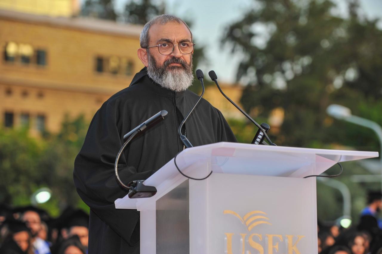 وألقى رئيس جامعة الروح القدس- الكسليك الأب طلال هاشم كلمة رحّب في مستهلّها بالحضور، باسم قدس الأب العام نعمة الله الهاشم، الرئيس العام للرهبانيّة اللبنانيّة المارونيّة والرئيس الأعلى للجامعة. وقال: “أتوجّه أوّلًا إلى الأهل لأقول أنّها ليست المرّة الأولى التي تشهدون فيها نجاح أبنائكم. وما هذا النجاح سوى ثمرة جهودٍ وتضحياتٍ كبيرة قمتم بها في أحلك الظروف وأصعبها. ولا أظنّ أنّ دوركم قد انتهى هنا، فأنتم مستعدّون دائمًا لتنمية ما زرعتم في أولادكم من بذور القيم الروحيّة والإنسانيّة والوطنيّة. وأعرف أنكم قلقون على مستقبلهم رغم النجاح الباهر الذي أحرزوه، ولكن الروح القدس سيقودهم نحو الخير الذي نتمنّاه جميعًا لهم. ولا شك في أنّ جامعتنا، ابنة الرهبانيّة اللبنانيّة المارونيّة، تضخّ في عروق هذا الوطن دمًا نقيًا كفيلاً بالقضاء على كل ما فيه من فساد، وها إنّي أرى فجر لبنان يبزغ من عيونهم مبشّرًا بمستقبلٍ زاهر. فلنفرح ولنفتخر بهم جميعًا”.