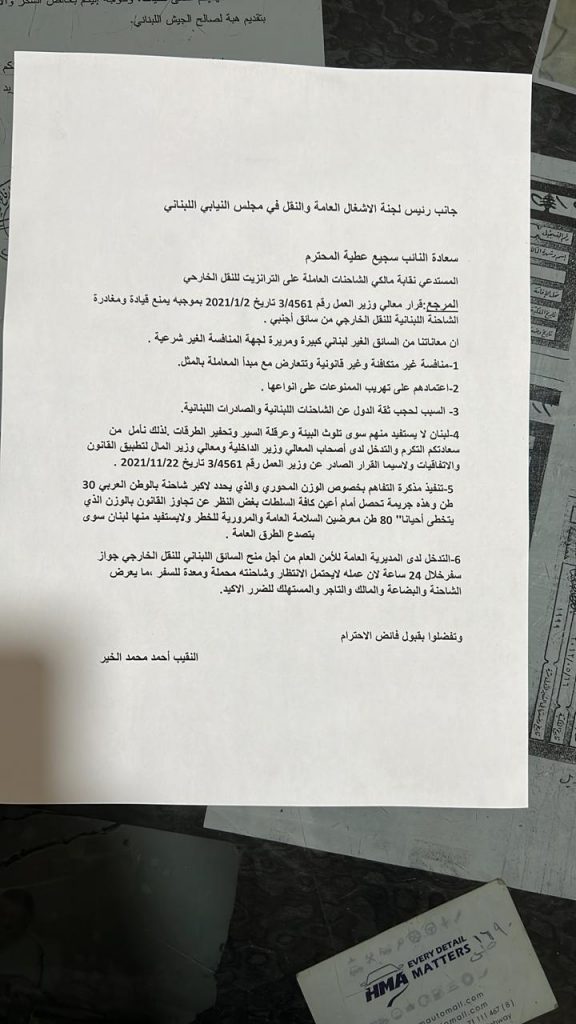 وقام النقيب الخير بتسليم سعادة النائب رساله تحمل المطالب الضروريه وتوجه الوفد بالشكر والأمتنان لسعادته على مشروع القانون المعجل بخصوص اعفاء شاحنات النقل الخارجي من المكانيك والذي تقدم به من المجلس الكريم بسبب توقف الأسطول عن العمل ..