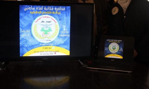 ولقد تم حضور المحاضرة زهاء الخمسين طالبا ” من طلّاب المرحلة المتوسّطة، الثّانوية و الجامعيّة من بلدتي عيات والبرج عكار والجوار لمدّة ساعتين بعنوان “أبرز الأخطاء الشّائعة في اللّغة الإنكليزية” .