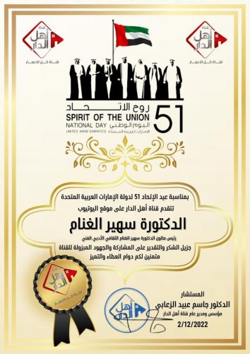كرمت قناة أهل الدار ومؤسسها سعادة الدكتور جاسم عبيد دكتورة سهير الغنام في العيد الوطني لدولة الإمارات العربية المتحدة 51