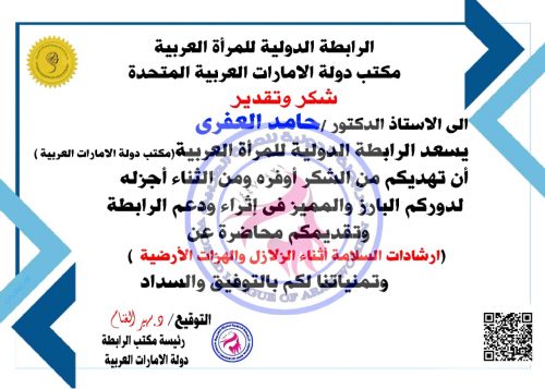 ثم قدمت رئيسة مكتب الرابطة الدولية للمرأة العربية بالإمارات دكتورة سهير الغنام شهادة التقدير لسعادة الدكتور حامد العفري ٠