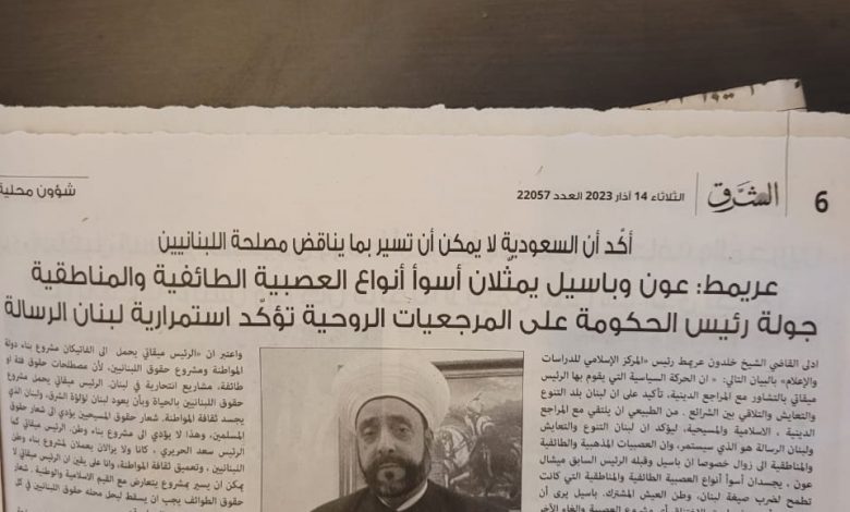 ادلى القاضي الشيخ خلدون عريمط رئيس “المركز الإسلامي للدراسات والإعلام” بالبيان التالي: ” ان الحركة السياسية التي يقوم بها الرئيس ميقاتي بالتشاور مع المراجع الدينية، تأكيد على ان لبنان بلد التنوع والتعايش والتلاقي بين الشرائع . من الطبيعي ان يلتقي مع المراجع الدينية ، الاسلامية والمسيحية، ليؤكد ان لبنان التنوع والتعايش ولبنان الرسالة هو الذي سيستمر، وان العصبيات المذهبية والطائفية والمناطقية الى زوال خاصة ان باسيل وقبله الرئيس السابق ميشال عون ، يجسدان أسوأ أنواع العصبية الطائفية والمناطقية التي كانت تطمح لضرب صيغة لبنان، وطن العيش المشترك. باسيل يرى أن مشروعه أصبح في طريق الاختناق أي مشروع العصبية والغاء الآخر بمعنى انه يريد ان يبني لبنان على مقاسه، وعلى مقاس مشروعه . التلاقي السعودي – الايراني ، مقبرة لما كان يسير به باسيل من حيث ان يتحول لبنان الى بلد الصراعات وان يكون ملحقا ضمن محور فارسي”.