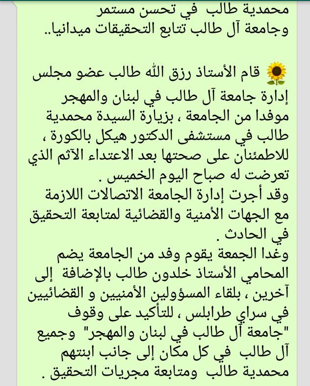 اضافت طالب كلنا ثقة بالمؤسسات العسكرية والأمنية وبالقضاء اللبناني يجب احقاق الحق ومحاسبة المعتدي وإجراء ما هو مقتضى وفقا” للأصول ..