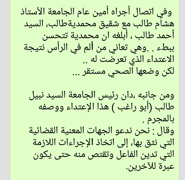 نحن آل طالب عموماً ،، ندين هذا الاعتداء على سيدة الاعمال الناجحة والمتميزة محمدية طالب ،، ونطلب من القضاء الاقتصاص من هذا المعتدي وإنزال أشد العقوبات بحقه منعاً لتكرار هكذا هذه الحركات الهمجية