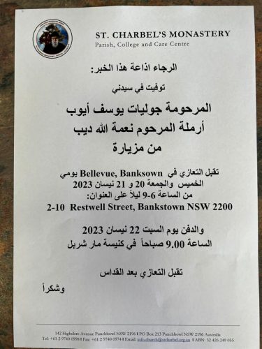 The funeral service will be held at St Charbels Church Punchbowl on Saturday 22 April, 2023 at 9am.