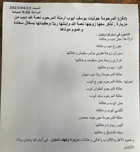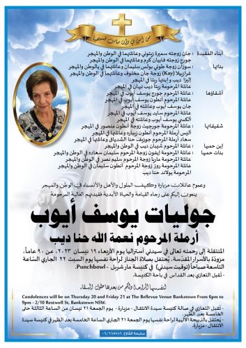 بمزيد من الحزن نعلن وفاة والدتنا الحبيبة وجدتنا جوليت يوسف ايوب زوجة المرحوم نعمة الله ديب.