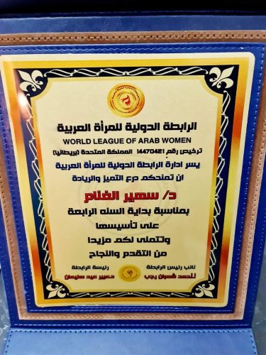 وعلى أنغام الموسيقى سلمت مؤسسة الرابطة سعادة الدكتورة عبير عيد سليمان شهادة الدكتوراة الفخرية لسعادة الدكتورة سهير الغنام بحضور النائب الأول للرابطة سعادة المستشار أحمد شعبان والسادة الدكترةوأعضاء وعضوات الرابطة الدولية للمرأة العربية كذلك تسلمت الأديبة الشاعرة دكتورة سهير الغنام بعد حفل العشاء وفي أجواء مبهجة درع التميز والريادة