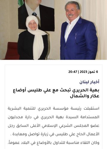 استقبلت رئيسة مؤسسة الحريري للتنمية البشرية المستدامة السيدة بهية الحريري في دارة مجدليون عضو المجلس الشرعي الإسلامي الأعلى السابق رجل الأعمال الحاج علي طليس في زيارة تواصل ومعايدة .